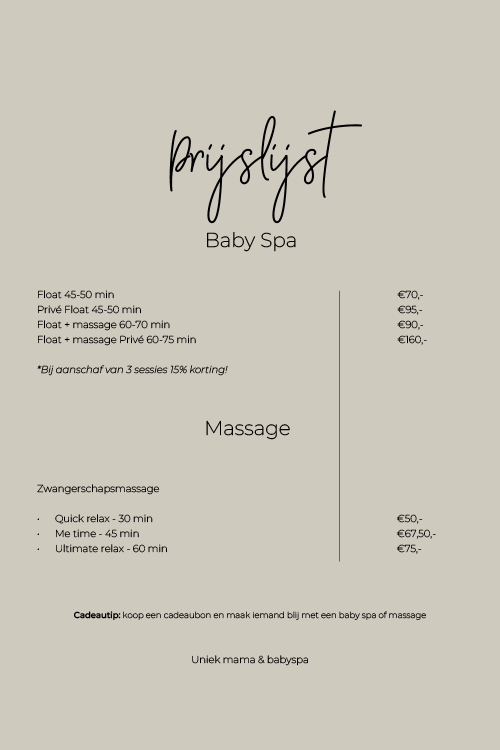 Bij Uniek geloven we dat elk moment met je baby bijzonder is. Onze Mama & Baby Spa is speciaal ontworpen om jouw kleintje te laten ontspannen, spelen en genieten van de voordelen van hydrotherapie en babymassage. Onze professionele en liefdevolle medewerkers zorgen ervoor dat elke sessie niet alleen veilig en hygiƫnisch is, maar ook een onvergetelijke ervaring.